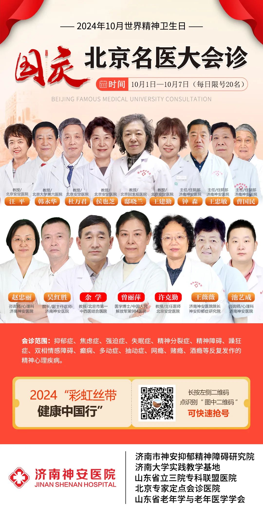 2024年国庆节来临,10月10日又逢世界精神卫生日,值此契机,为了积极响应国家卫生健康委关于精神心理疾病的相关援助、康复指导等要求,帮助这部分患者早日重获康复,回归正常生活和工作,济南神安医院特联合北京安定医院、北京市第一中西医结合医院、中国人民解放军第984医院等名院名医,发起“10月大型北京专家会诊月”暨“2024彩虹丝带健康中国行”会诊活动,重点开展抑郁症、焦虑症、精分、躁郁症、强迫症、癫痫、酒瘾、网瘾、赌瘾、多动抽动症等精神心理疾病的诊治工作。10月1日-7日,并有更多专项医疗援助,惠泽广大患者,最大限度减轻群众医疗负担。